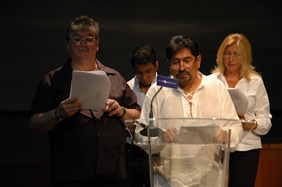 Aquí tenéis unas fotografías que Norma Quintana me ha enviado sobre el entrañable homenaje a mi persona y la extraoficial presentación de mi libro, en el Cultural Koín. Me prepararon un escenario-sorpresa que me emocionó por el trabajo y el cariño con el que fue realizado. En las fotos de arriba aparezco con Rigoberto Cairo, que fue conductor del acto y es el director de este centro de inmigrantes, además de ser poeta. También están los poetas Miguel Pastrana y Antonio Ruiz. En las fotografías inferiores me acompañan Rigo, la cantante Charito Piquer, y el grupo de origen Boliviano, Lejanía, que interpretó música andina. Me emocionó la calidez con la que todos me rodearon, y los increíbles detalles de los que me hizo objeto Rigo. Por ejemplo, el de haber escuchado mi poema Aixa recitado, sucesivamente, por ocho voces y acentos distintos entre ellos estaban el acento cubano, el peruano, el ecuatoriano, el colombiano,el español, el boliviano... Fue tremenda la impresión que causaron en mí, ¡qué difícil reunir tantos acentos diferentes y tener la suerte de escucharlos poniéndole voz a un poema mío! Fue un increíble regalo. Aunque el momento más emocionante de la tarde se dio cuando guardamos un minuto de silencio por las víctimas del 11 S y por el Presidente Allende. Rigo recitó la canción musicalizada por Pablo Milanés: Yo pisaré las calles nuevamente. Y yo estrené el poema, que todavía no tenía nombre, para Salvador Allende, y al que el poeta colombiano, Carlos Muquitay, bautizó con uno de los versos: Mi sangre es la corriente de mi pueblo. Tarde inolvidable para todos.